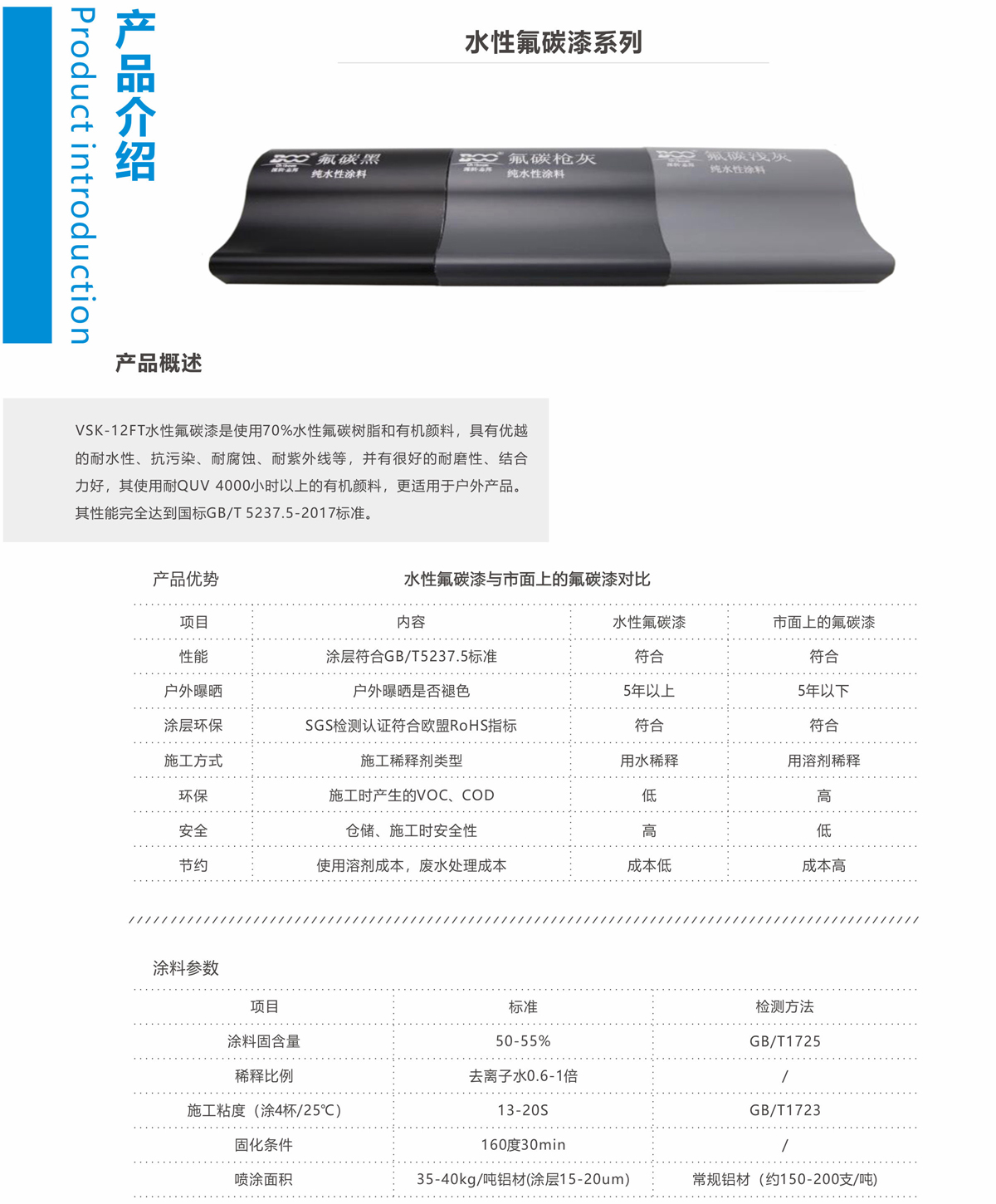 VSK-12FT水性氟碳漆是使用70%水性氟碳树脂和有机颜料,具有优越的耐水性、抗污染、耐腐蚀、耐紫外线等,并有很好的耐磨性、结合力好,其使用耐QUV4000小时以上的有机颜料,更适用于户外产品。其性能完全达到国标GB/T52375-2017标准。